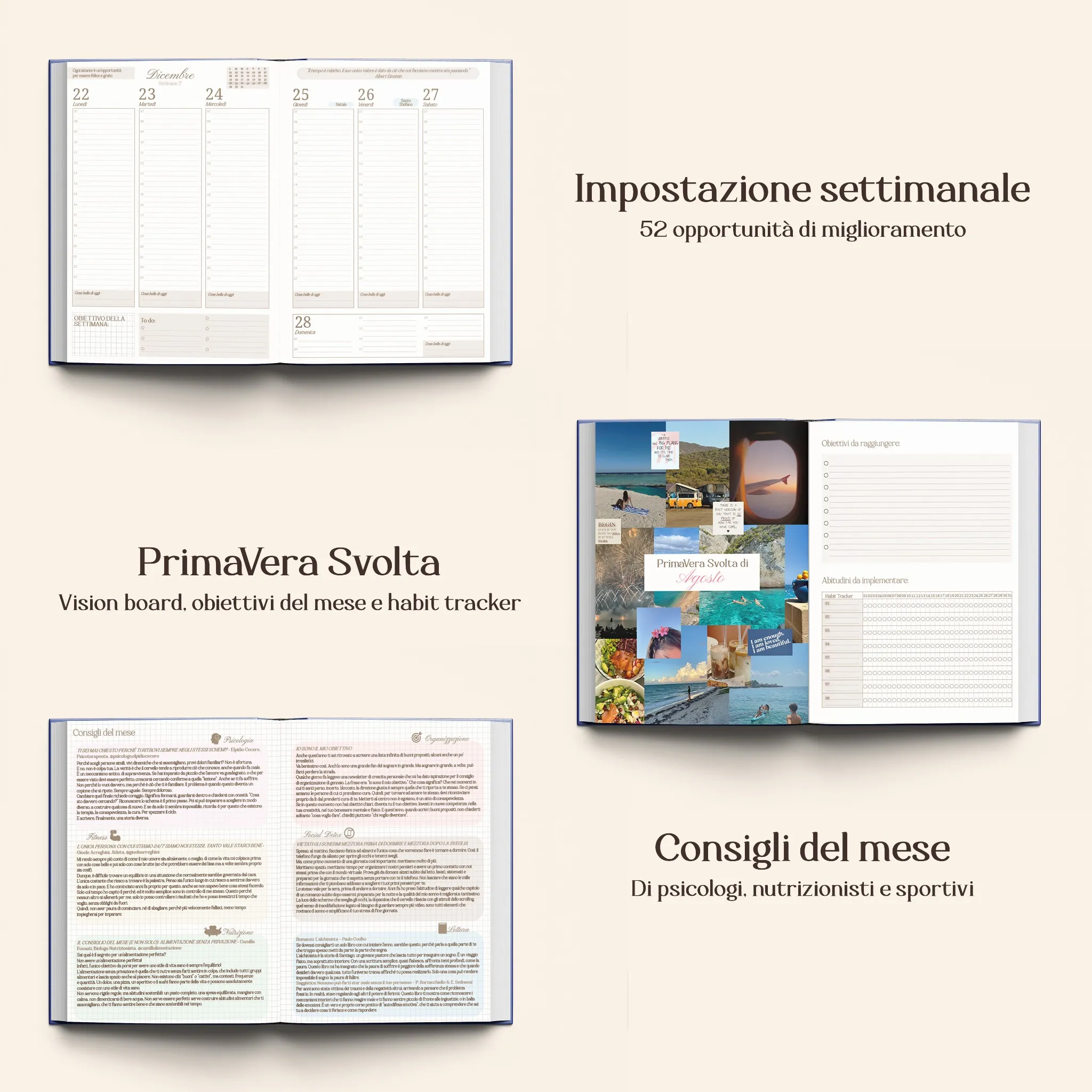 La PrimaVera Agenda è un percorso guidato della durata di 12 mesi per vivere un anno all'insegna dell'organizzazione e della crescita personale. Ogni particolare è stato studiato per supportarti nel raggiungimento dei tuoi obiettivi, mantenere alta la motivazione e migliorare la tua produttività.